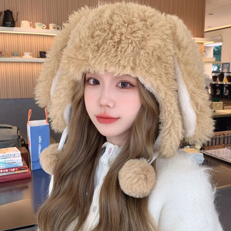 Autumn and winter new cute big ear furry hat girls plus fluffy ear hat cartoon soft cute ball soft fabric